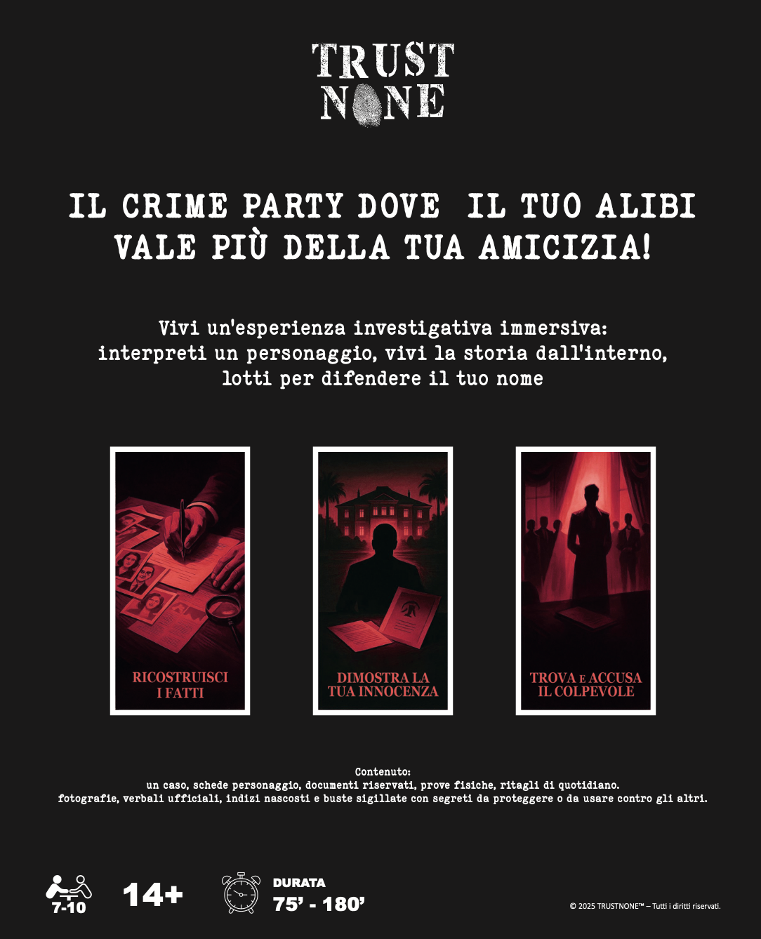 Non è il solito “cold case da tavolo” dove leggi carte per ore. Qui sei tu il sospettato, con un ruolo da difendere e un gruppo che alla fine deve accusare davvero qualcuno.